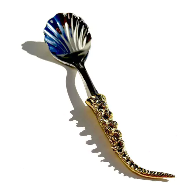 Cuchara de postre con forma de ostra de acero inoxidable y mangos diversos realizadas en bronce o alpaca. Medidas: 14,5 X 3,5 cm. Peso: 12 g. Hecho a mano, libre de plomo.