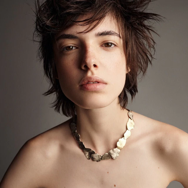 Gargantilla con dijes de Piel, con textura de huellas dactilares, articulada. Disponible en alpaca o mix de 3 dijes enchapados en oro 18k. Cierre con perno. Hecho a mano. Largo 42 cm. Ancho máximo: 3cm. Peso: 94 g. Libre de plomo.